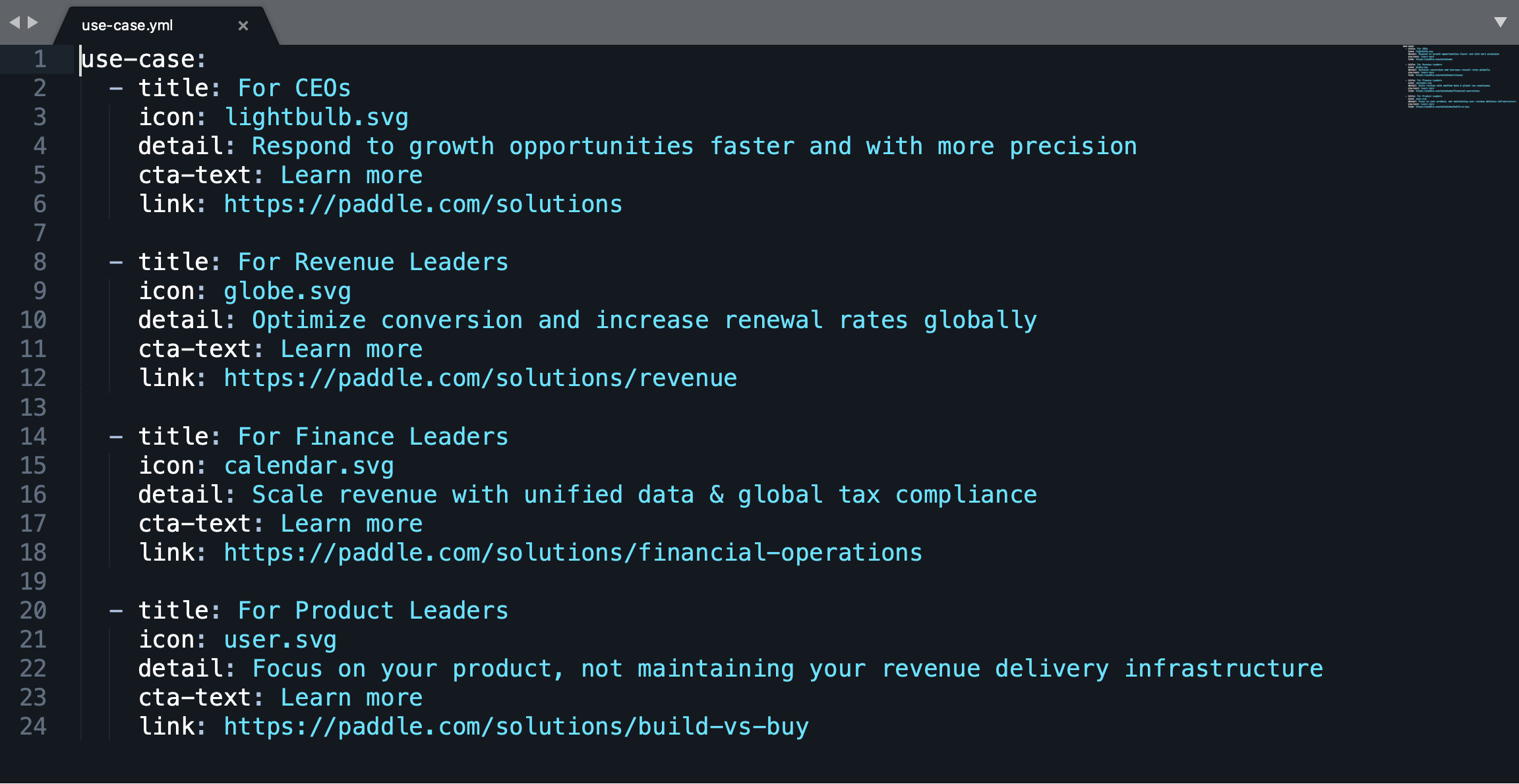 Paddle pages and components are built using Jekyll as a foundation. The page content is stored in .yml files and generated locally. This allows Paddle's website to load fast but also lessens the risk of relying on a database.